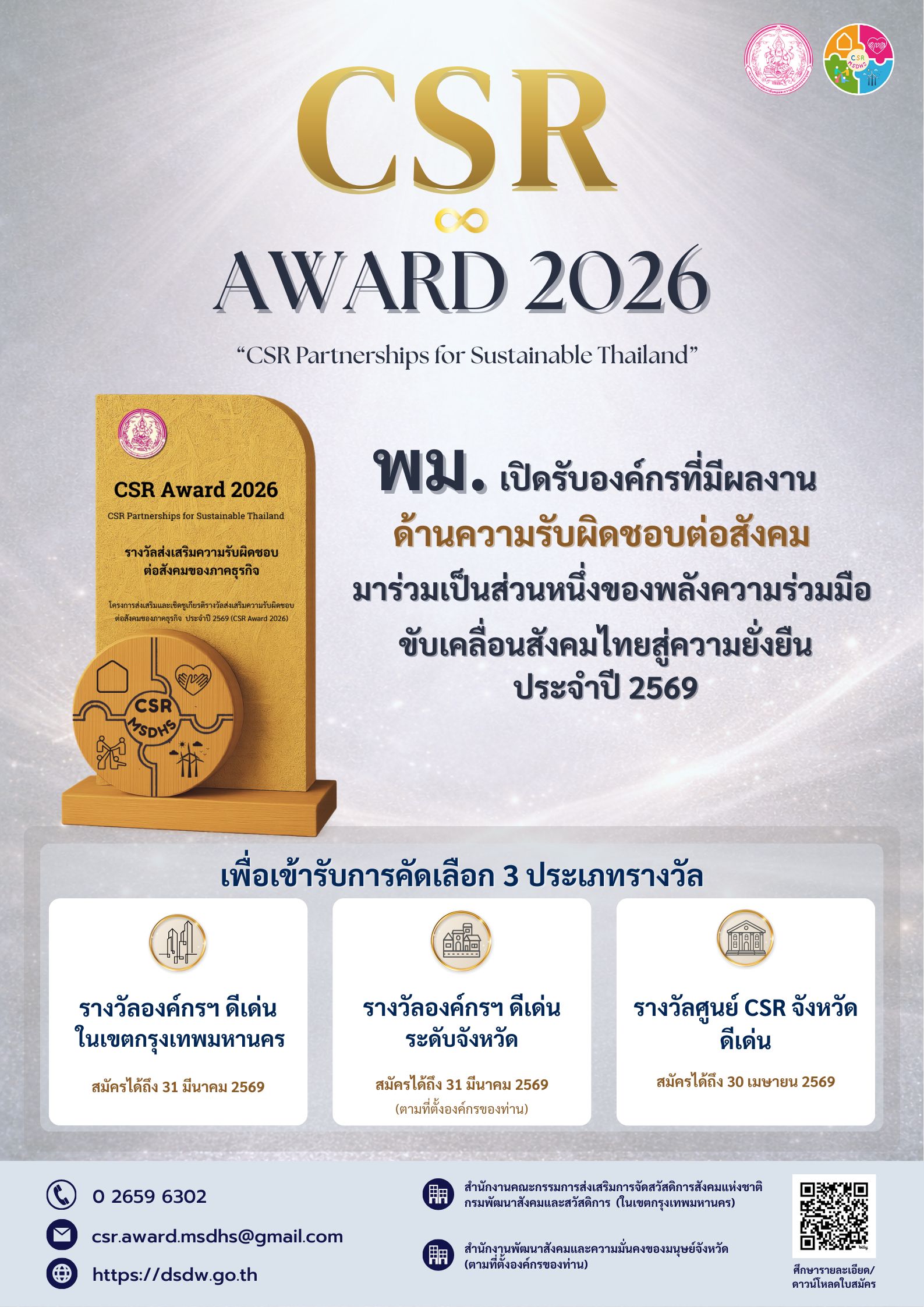พม.เปิดรับองค์กรที่มีผลงานด้านความรับผิดชอบต่อสังคมมาร่วมเป็นส่วนหนึ่งของพลังความร่วมมือขับเคลื่อนสังคมไทยสู่ความยั่งยืน ประจำปี 2569 ( CSR Award 2026 )
